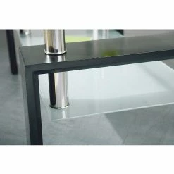 - Vier Metallstützen verbinden Gestell und Glasplatten